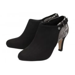Ladies meet your new wardrobe go-to, introducing the Lotus Laurel boot! Sitting just above the ankle, this women’s black faux suede boot takes design elements from a Chelsea boot but with subtle upgrades. Overlapping an elasticated side panel is an interlinking wraparound buckle feature that is enhanced with a mock-croc print. This distinctive print has also been applied to the glossy heel counter, plus a metal trim insert has been incorporated into the 3cm heel. Easy to wear and even easier to style, this ladies’ ankle boot will quickly become an all-time favourite.