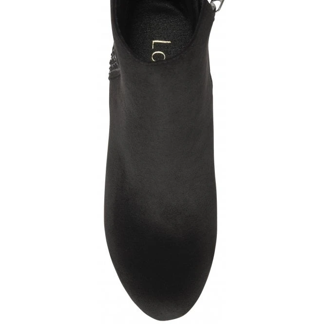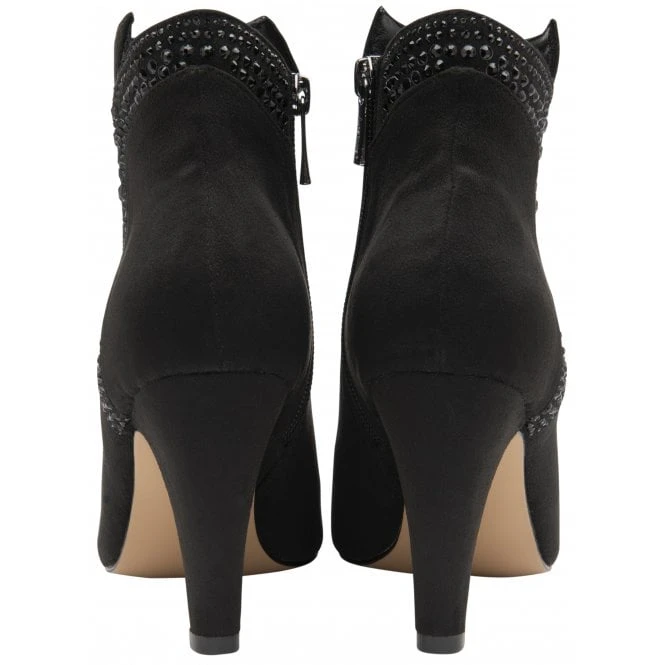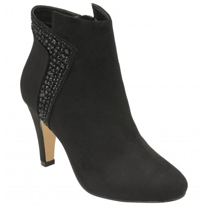 Add the perfect finish to any glamourous ensemble with the stunning Lotus Emma ankle boot. This sleek women’s boot exudes charm due to the sumptuous imi-suede upper and the band of sparkling diamantes that run up the side of this black boot and wrap around the back. This almond pointed toe ankle boot also sits on a 9cm stiletto heel, making this eye-catching silhouette wearable.