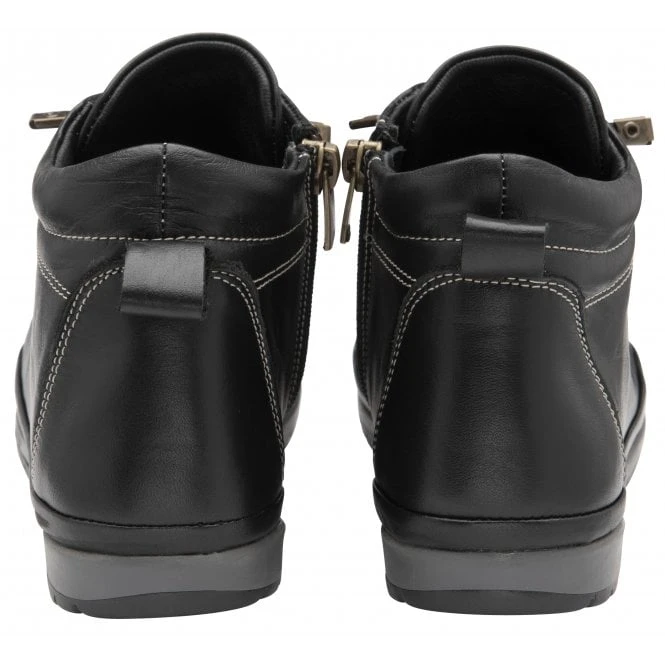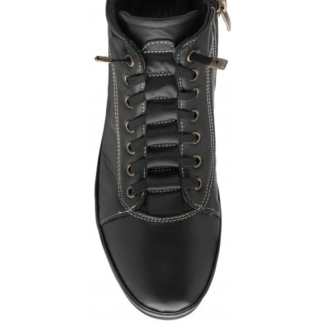 The Lotus Frida is the perfect trainer boot hybrid that off duty looks call for! This casual, almost flat, ladies’ ankle boot emulates the aesthetic of a trainer due to the elasticated laces incorporated. As well as featuring a pull tab, this premium leather black leather boot encompasses an inside zip to help with getting the style on/off effortlessly.