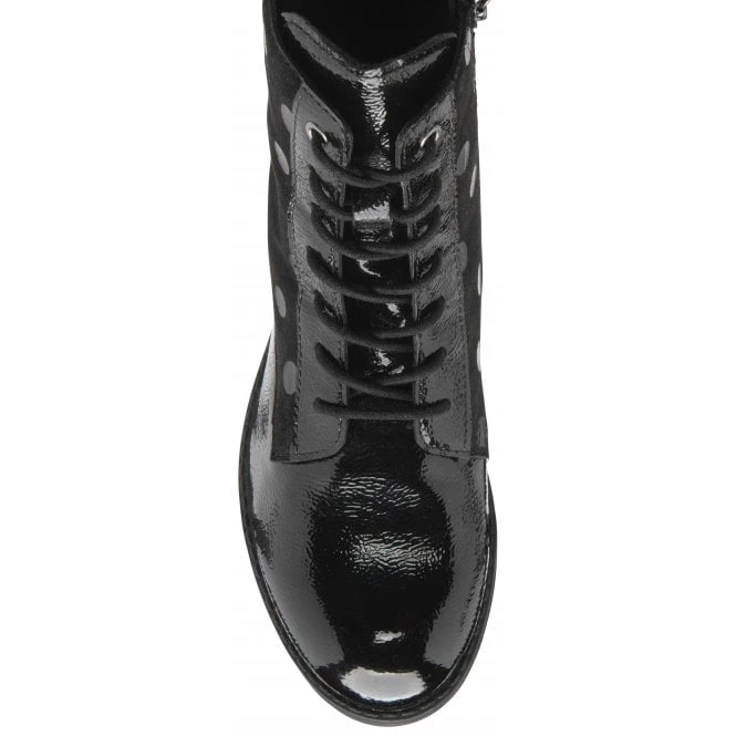 The Lotus Hawaii ankle boot is the perfect complement to an abundance of looks, whether it be favourite denim pieces, cute dresses or faux leather leggings. Giving this casual women’s lace-up boot a distinctive finish is the textile side panel that encompasses a multitude of matt spots. This women’s black patent boot is exceptionally versatile, highly wearable due to the 3cm block heel and easy to get on/off due to the inside zip.