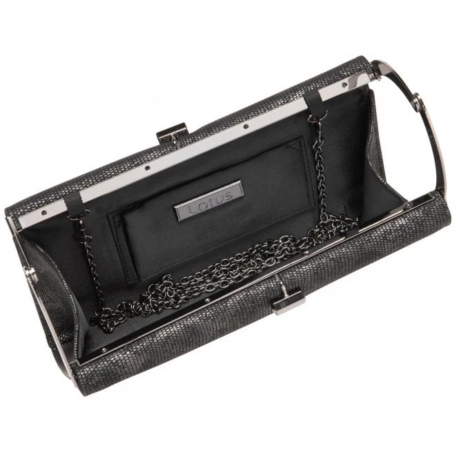 It is the tonal reptile print that embodies the Lotus Rosanna clutch bag that gives this sleek accessory a distinctive finish. Boasting a clasp fastening, a detachable chain shoulder strap for when you want to be hands free and an internal slip pocket, this Lotus black handbag is a contemporary addition to any wardrobe. This structured women’s box bag also perfectly coordinates with the Lotus Petunia court shoe.