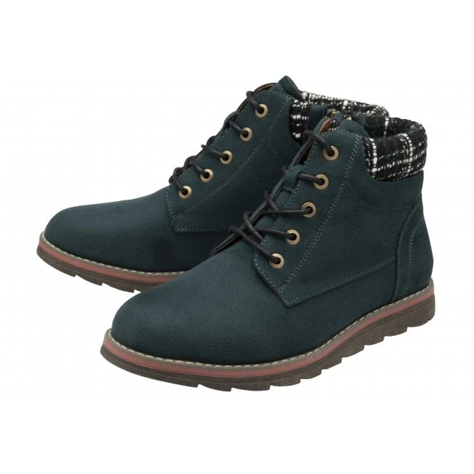 For a thoroughly modern-day aesthetic, add the almost flat Lotus Cedar lace-up ankle boot to casual looks. Influenced by the ever-popular hiker look, this Lotus women’s lace-up green boot boasts an imi-suede upper, a multicoloured knitted ankle collar, metal eyelets and a serrated sole unit.