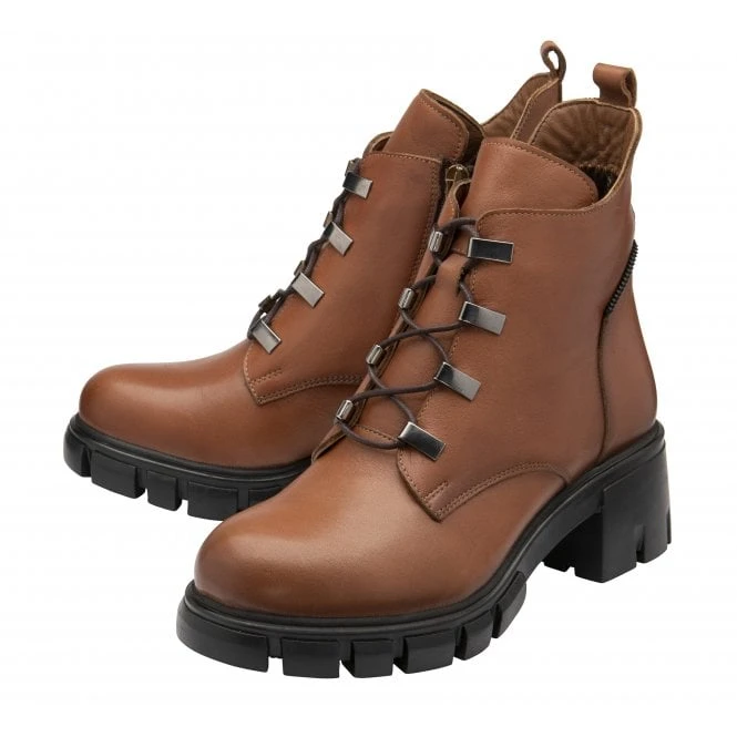 The new Lotus Lacie ankle boot works the chunky tread sole trend effortlessly to make it a true season essential. This women’s tan lace-up ankle boot is constructed from premium leather and encapsulates rectangular metal eyelets, decorative half zip detailing, a heavy cleated sole and an on-trend 5.5cm block heel. The Lotus Lacie ankle boot is the perfect pairing to casual looks this season.