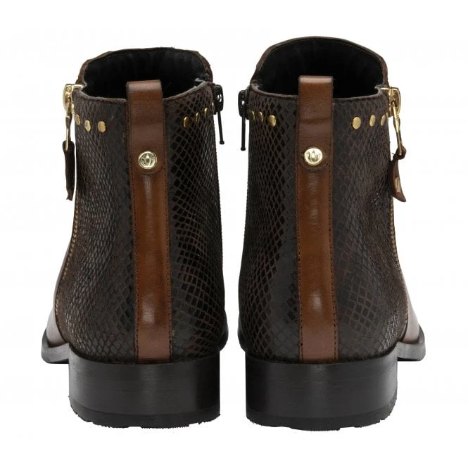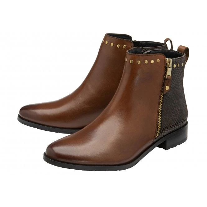 The Lotus women’s Moire leather ankle boot is a classic style with a modern twist to give it go-to appeal regardless of the season. Reptile print detailing with a high shine finish is applied to the back panels, whilst studding circles the top collar and an exposed zip adds the finishing touch. Sitting on a slight 3cm heel, this Lotus tan boot is a classic that’s easy to wear as it has a timeless, polished edge.