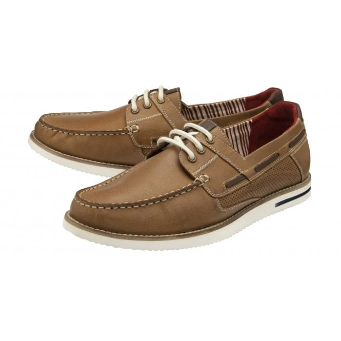 Set to appeal to the style minded man is the Lotus Princeton boat shoe. This Lotus tan men’s deck shoe is constructed from faux leather and boasts traditional moccasin stitching, interlinking lacing, a crisp white sole unit and a leather in-sock. We’ll be wearing Princeton with our favourite shorts and classic chinos this season.