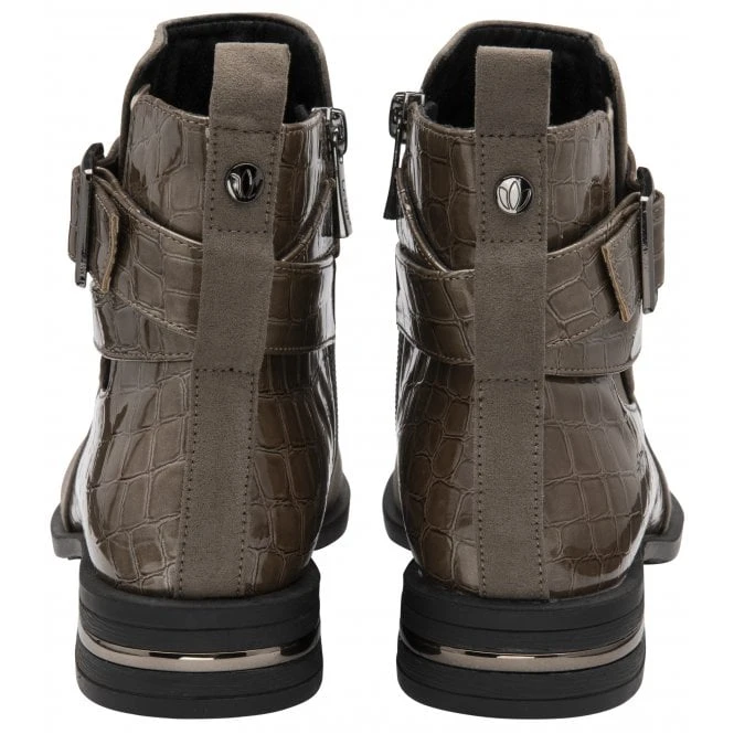 Ladies meet your new wardrobe go-to, introducing the Lotus Laurel boot! Sitting just above the ankle, this women’s taupe faux suede boot takes design elements from a Chelsea boot but with subtle upgrades. Overlapping an elasticated side panel is an interlinking wraparound buckle feature that is enhanced with a mock-croc print. This distinctive print has also been applied to the glossy heel counter, plus a metal trim insert has been incorporated into the 3cm heel. Easy to wear and even easier to style, this ladies’ ankle boot will quickly become an all-time favourite.